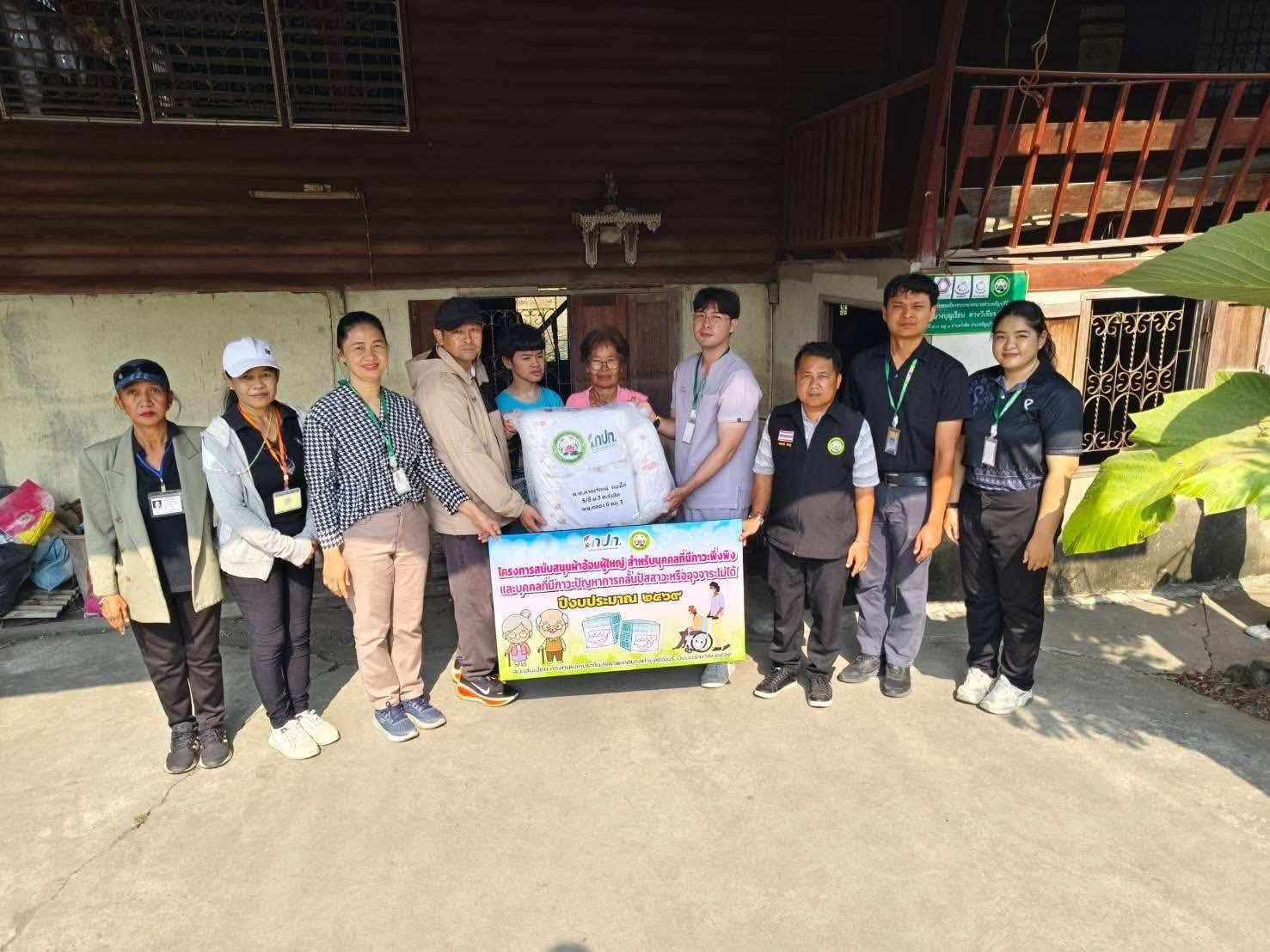 พร้อมด้วยเจ้าหน้าที่สหวิชาชีพกายภาพบำบัด/แพทย์แผนไทย/พยาบาลวิชาชีพ ให้คำแนะนำผู้ป่วยและผู้ดูแลผู้ป่วย เพื่อให้การใช้ชีวิตประจำวันมีคุณภาพชีวิตที่ดีขึ้น อสม./จิตอาสา และ ประธานกรรมการชุมชน ร่วมมอบ