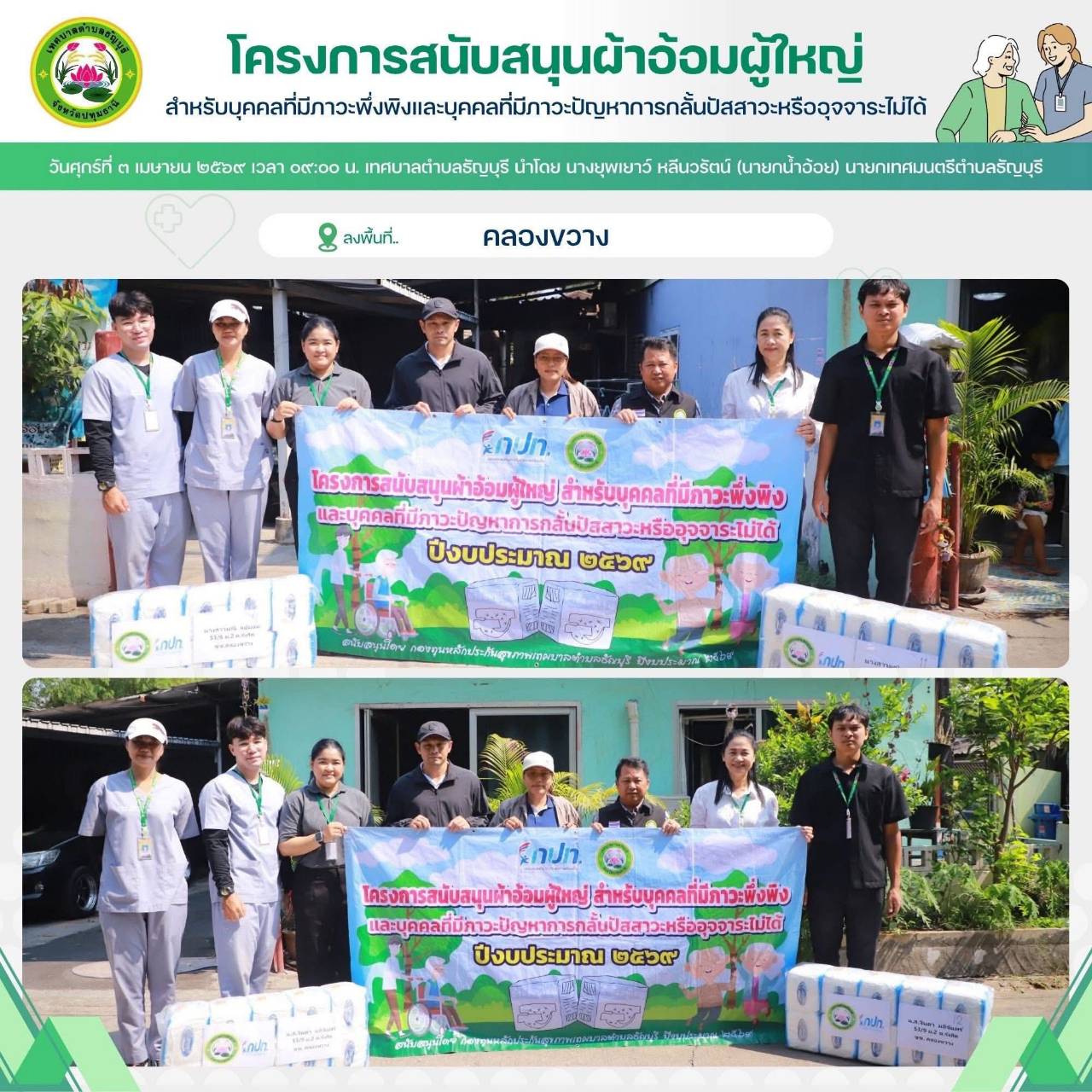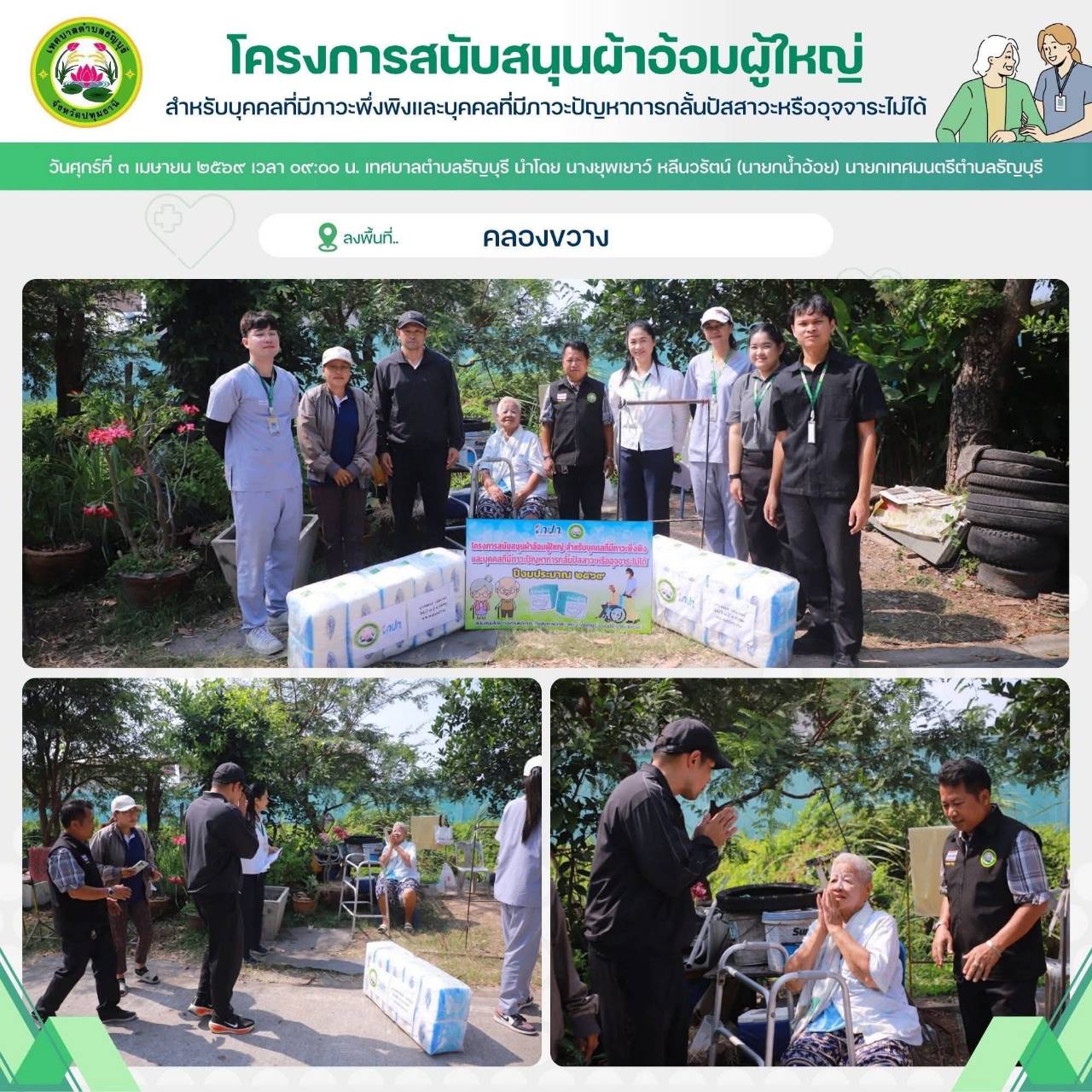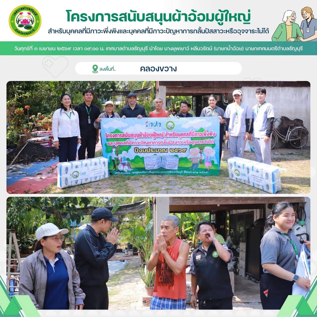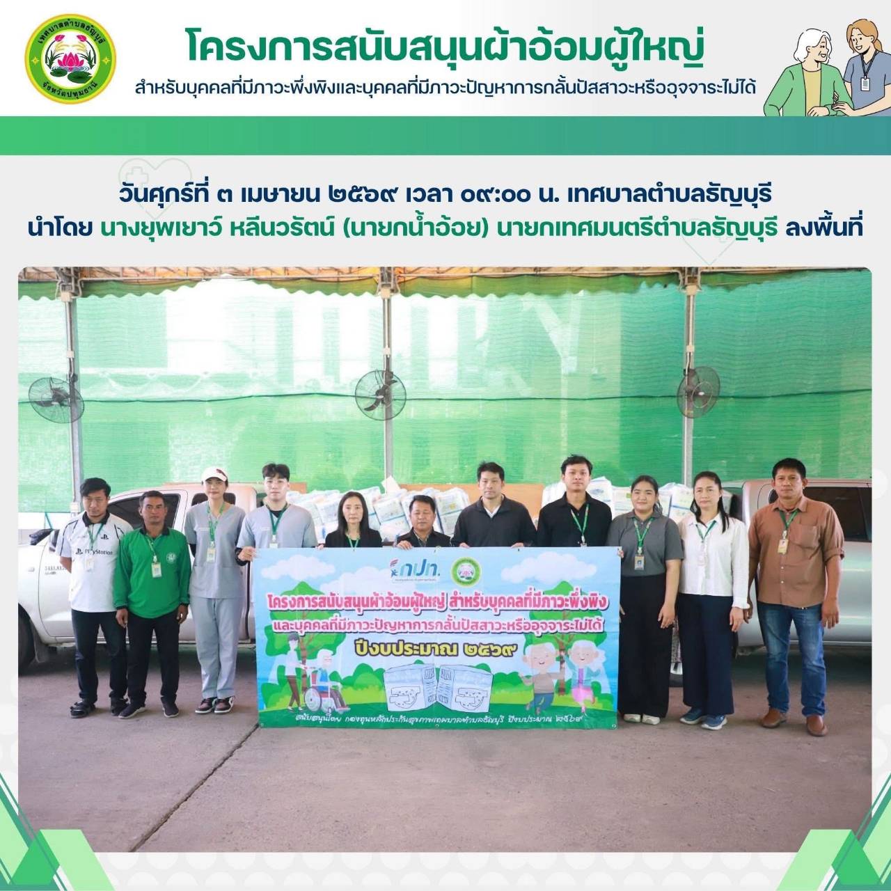 เทศบาลตำบลธัญบุรี นำโดย นางยุพเยาว์ หลีนวรัตน์ (นายกน้ำอ้อย) นายกเทศมนตรีตำบลธัญบุรี จัดทำโครงการสนับสนุนผ้าอ้อมผู้ใหญ่สำหรับบุคคลที่มีภาวะพึ่งพิง และบุคคลภาวะปัญหาการกลั้นปัสสาวะหรืออุจจาระไม่ได้ โดยผ่านการประเมิน ADL. ตามเกณฑ์ที่ สปสช.กำหนด