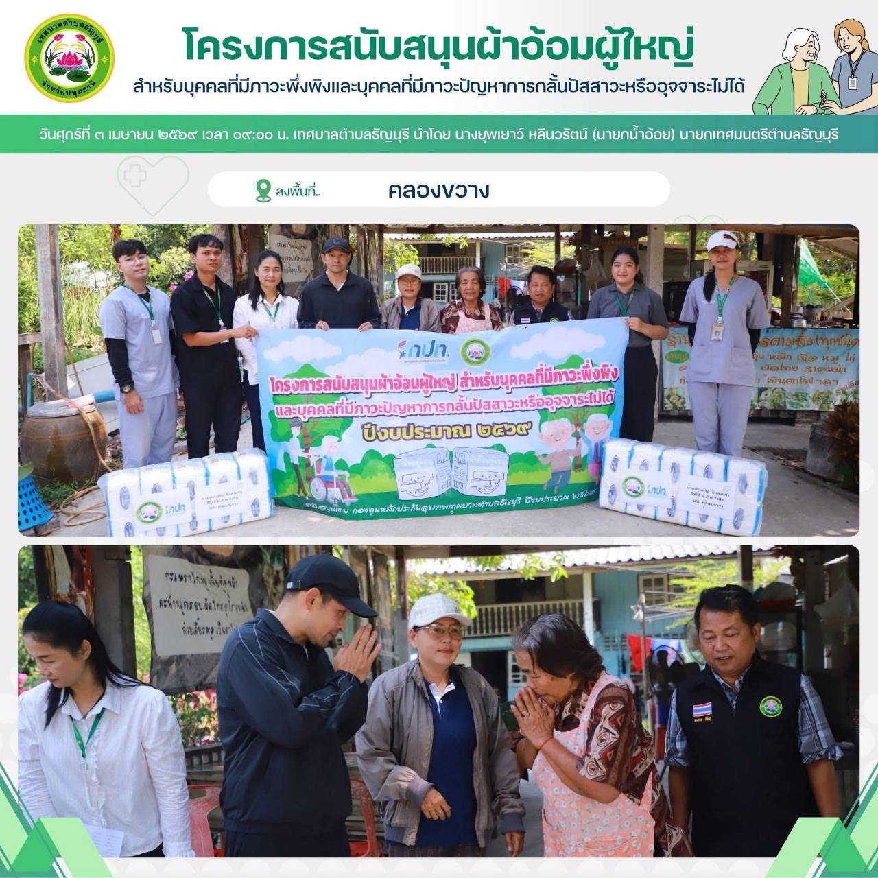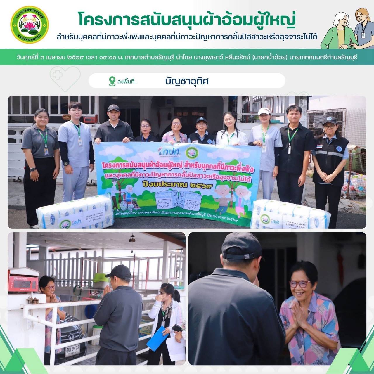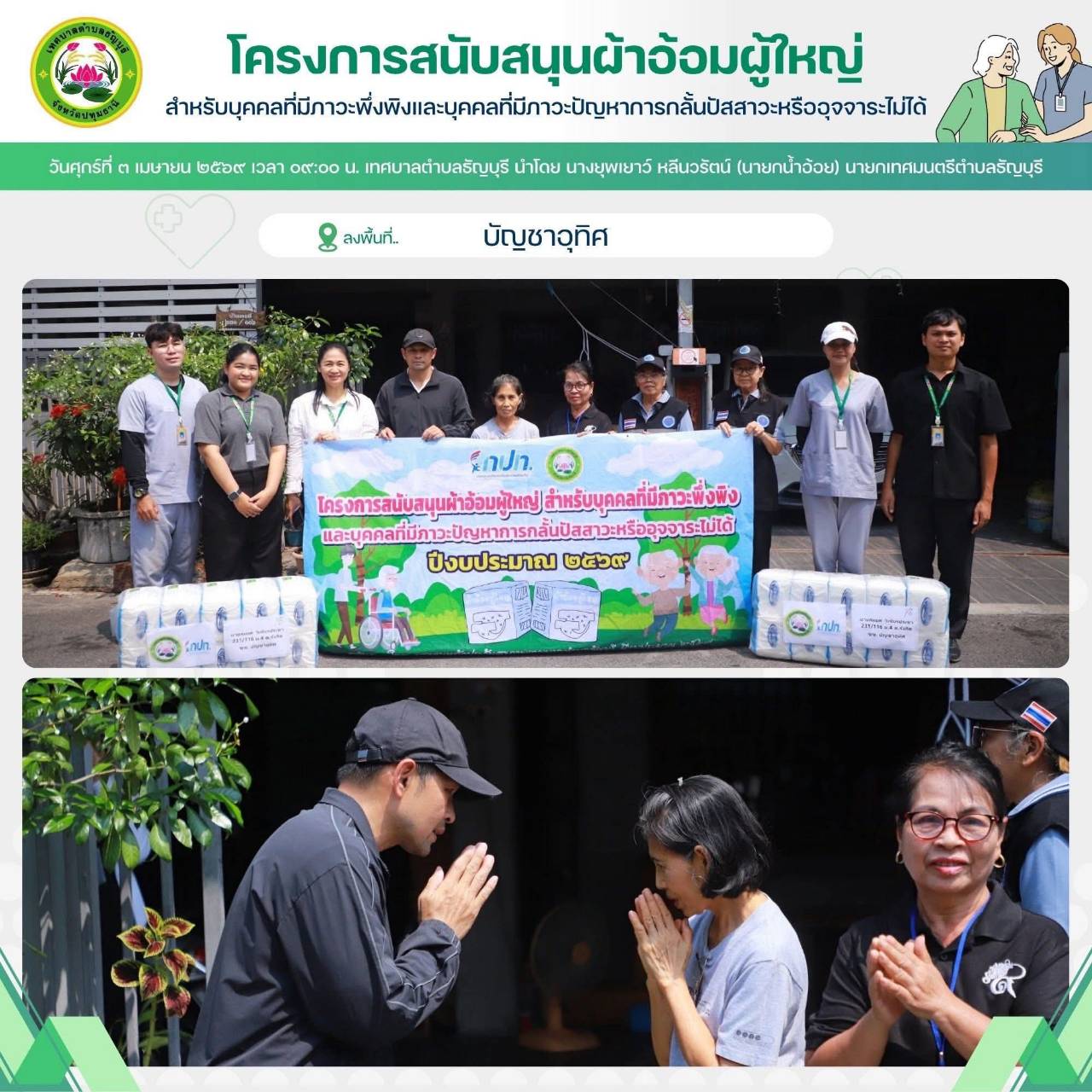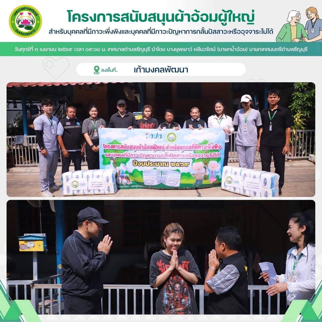 เทศบาลตำบลธัญบุรี นำโดย นางยุพเยาว์ หลีนวรัตน์ (นายกน้ำอ้อย) นายกเทศมนตรีตำบลธัญบุรี จัดทำโครงการสนับสนุนผ้าอ้อมผู้ใหญ่สำหรับบุคคลที่มีภาวะพึ่งพิง และบุคคลภาวะปัญหาการกลั้นปัสสาวะหรืออุจจาระไม่ได้ โดยผ่านการประเมิน ADL. ตามเกณฑ์ที่ สปสช.กำหนด