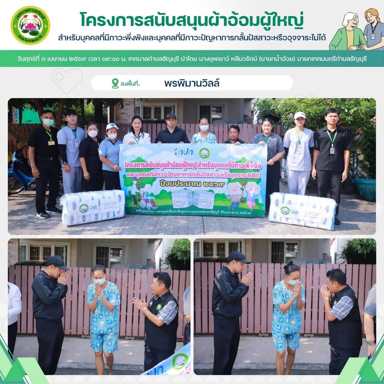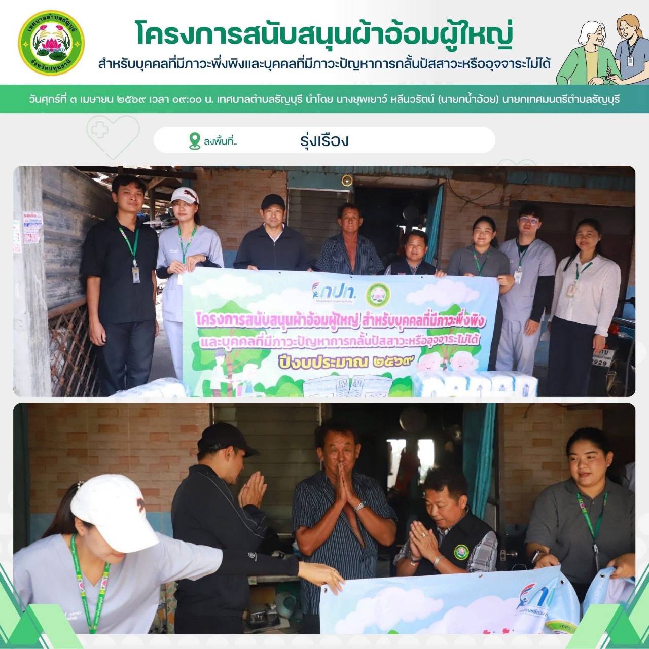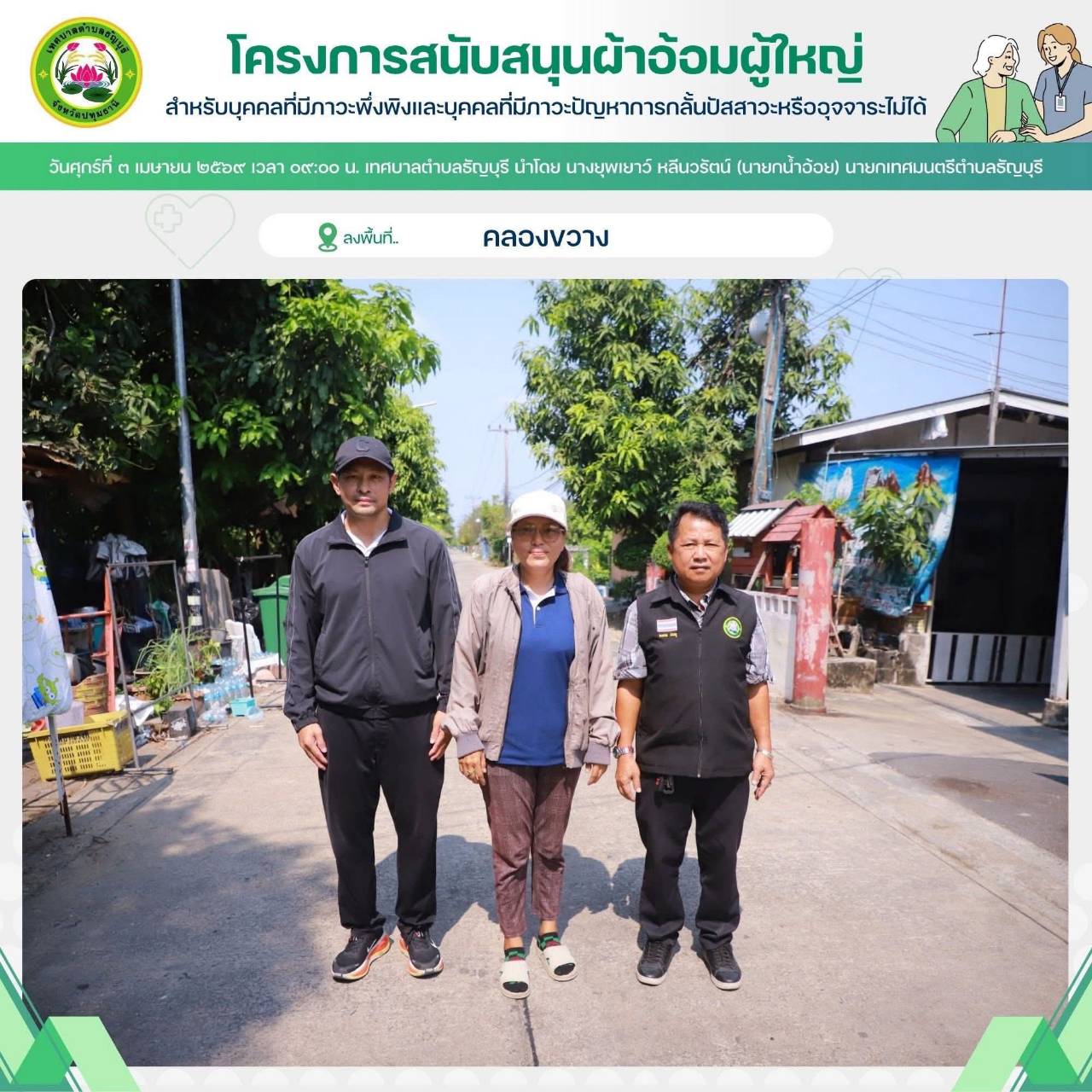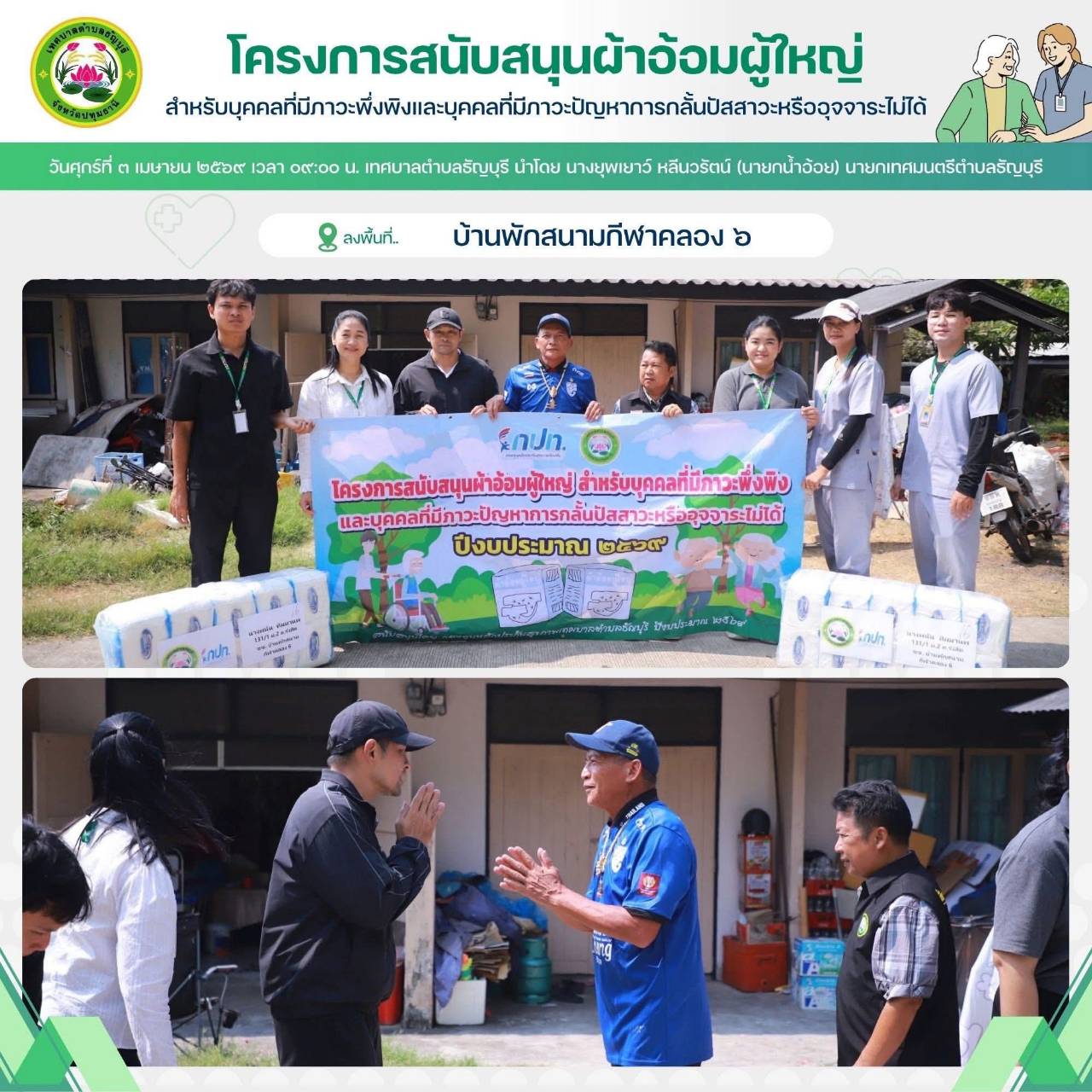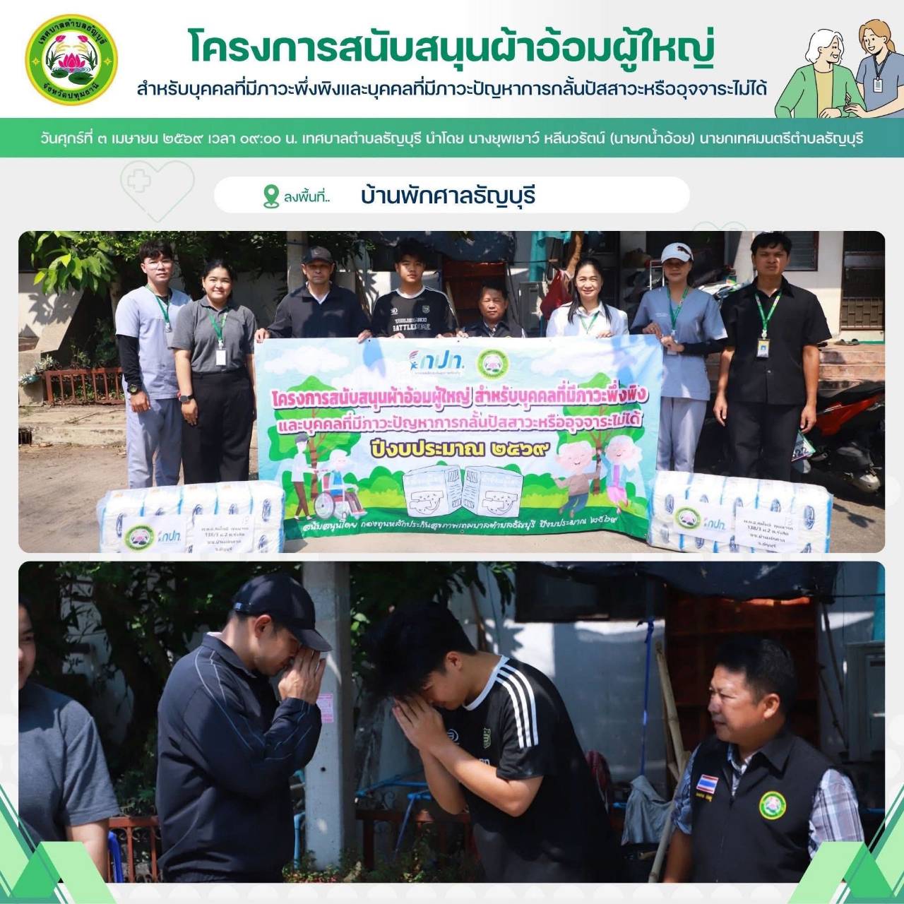 เทศบาลตำบลธัญบุรี นำโดย นางยุพเยาว์ หลีนวรัตน์ (นายกน้ำอ้อย) นายกเทศมนตรีตำบลธัญบุรี จัดทำโครงการสนับสนุนผ้าอ้อมผู้ใหญ่สำหรับบุคคลที่มีภาวะพึ่งพิง และบุคคลภาวะปัญหาการกลั้นปัสสาวะหรืออุจจาระไม่ได้ โดยผ่านการประเมิน ADL. ตามเกณฑ์ที่ สปสช.กำหนด