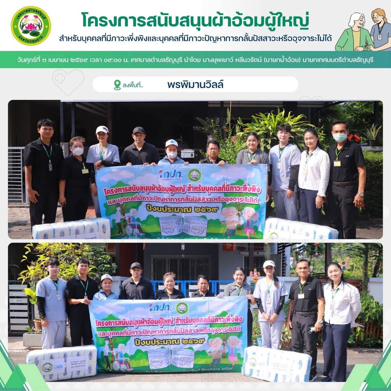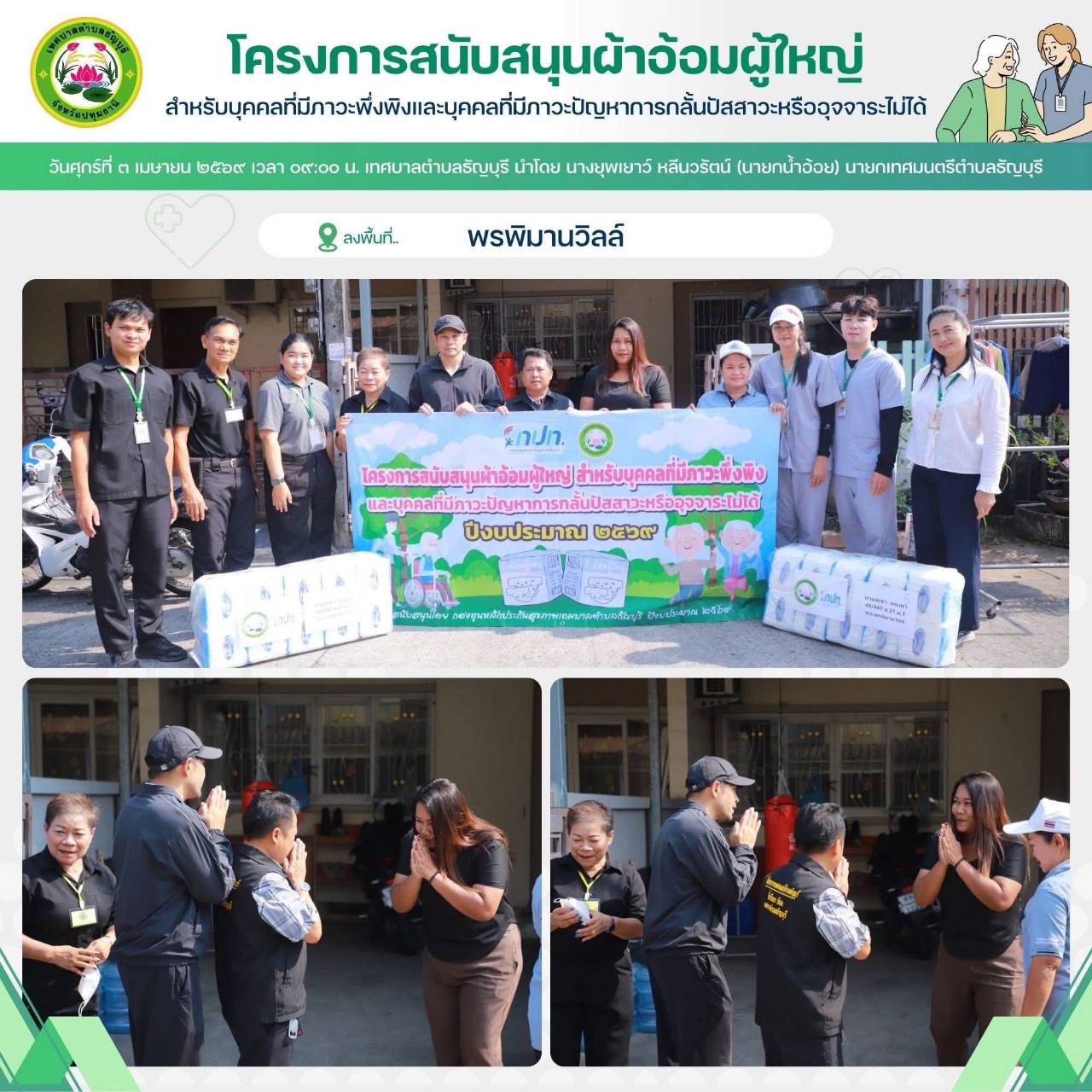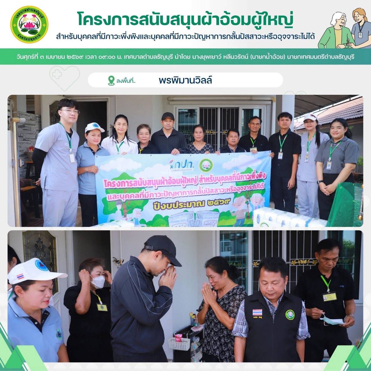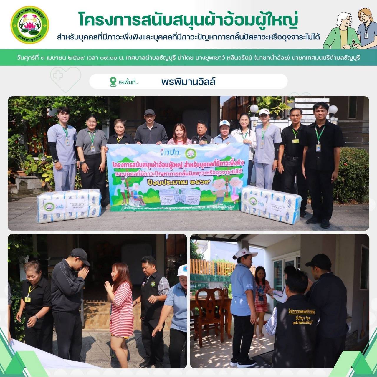 เทศบาลตำบลธัญบุรี นำโดย นางยุพเยาว์ หลีนวรัตน์ (นายกน้ำอ้อย) นายกเทศมนตรีตำบลธัญบุรี จัดทำโครงการสนับสนุนผ้าอ้อมผู้ใหญ่สำหรับบุคคลที่มีภาวะพึ่งพิง และบุคคลภาวะปัญหาการกลั้นปัสสาวะหรืออุจจาระไม่ได้ โดยผ่านการประเมิน ADL. ตามเกณฑ์ที่ สปสช.กำหนด