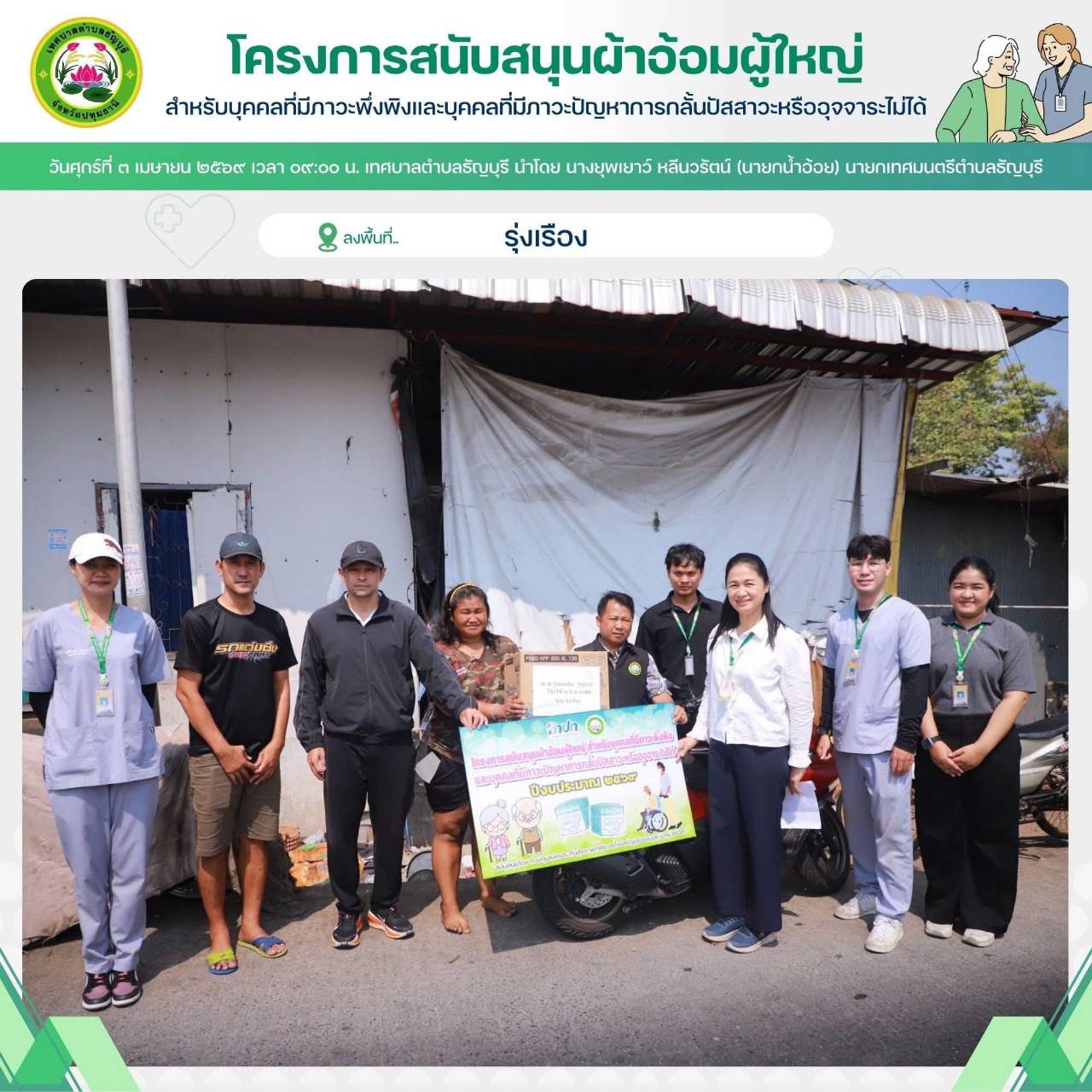 ตามที่จัดทำโครงการสนับสนุนผ้าอ้อมผู้ใหญ่ สำหรับบุคคลที่มีภาวะพึ่งพิง และบุคคลภาวะปัญหาการกลั้นปัสสาวะหรืออุจจาระไม่ได้ โดยผ่านการประเมิน ADL. ตามเกณฑ์ที่ สปสช.กำหนด ซึ่งเป็นลักษณะที่บอกถึง สภาพร่างกายและระดับความสามารถ ในการทำกิจวัตรประจำวันของผู้ป่วย จึงจำเป็นต้องใช้ผ้าอ้อมผู้ใหญ่ เพื่อนำไปใช้ในการดำรงชีวิตประจำวัน จัดได้ว่าเป็น กลุ่มที่ควรให้การสนับสนุน เพื่อให้บุคคลดังกล่าวได้รับการดูแล และเข้าถึงบริการสาธารณสุขในชุมชนอย่างทั่วถึงมากยิ่งขึ้น หมู่ ๑ และหมู่ ๒ ต.รังสิต จำนวน ๑๘ ราย