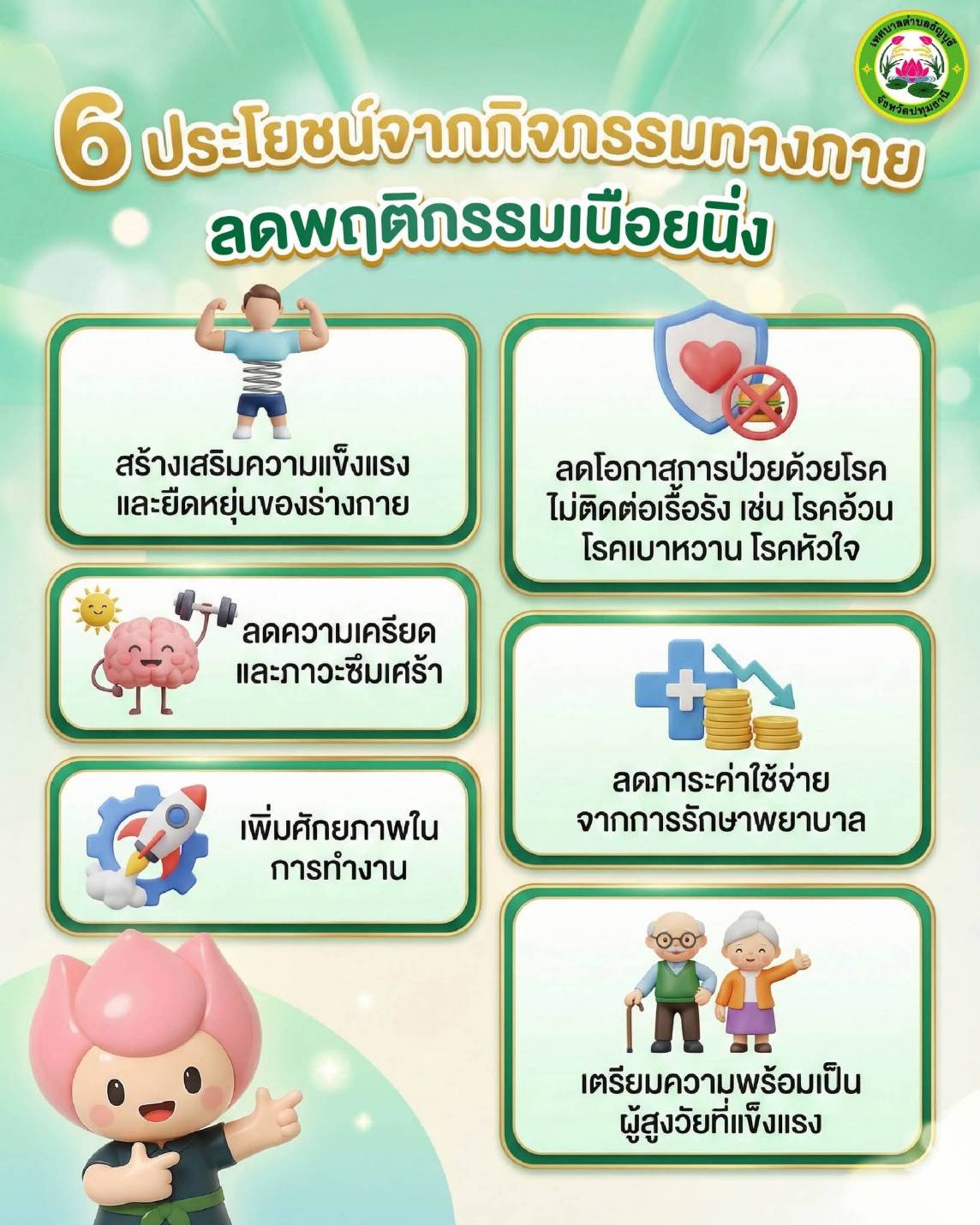 #6ประโยชน์กิจกรรมทางกาย #ลดพฤติกรรมนั่งเนือยนิ่ง #ขยับกายวันละนิดชีวิตสดใส #สุขภาพดีเริ่มที่ตัวเรา #เทศบาลตำบลธัญบุรี #กองสาธารณสุขและสิ่งแวดล้อม