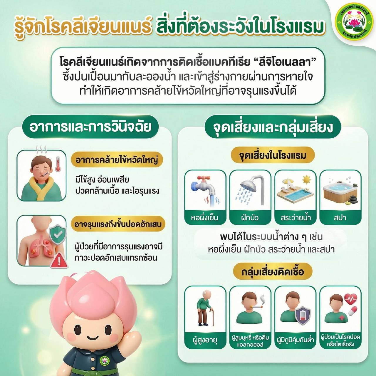 #โรคลีเจียนแนร์ #โรงแรมปลอดภัย #สุขาภิบาลน้ำ #เที่ยวอย่างรู้เท่าทัน #ดูแลสุขภาพปอด #เทศบาลตำบลธัญบุรี #สุขภาพดีเริ่มที่ตัวเรา