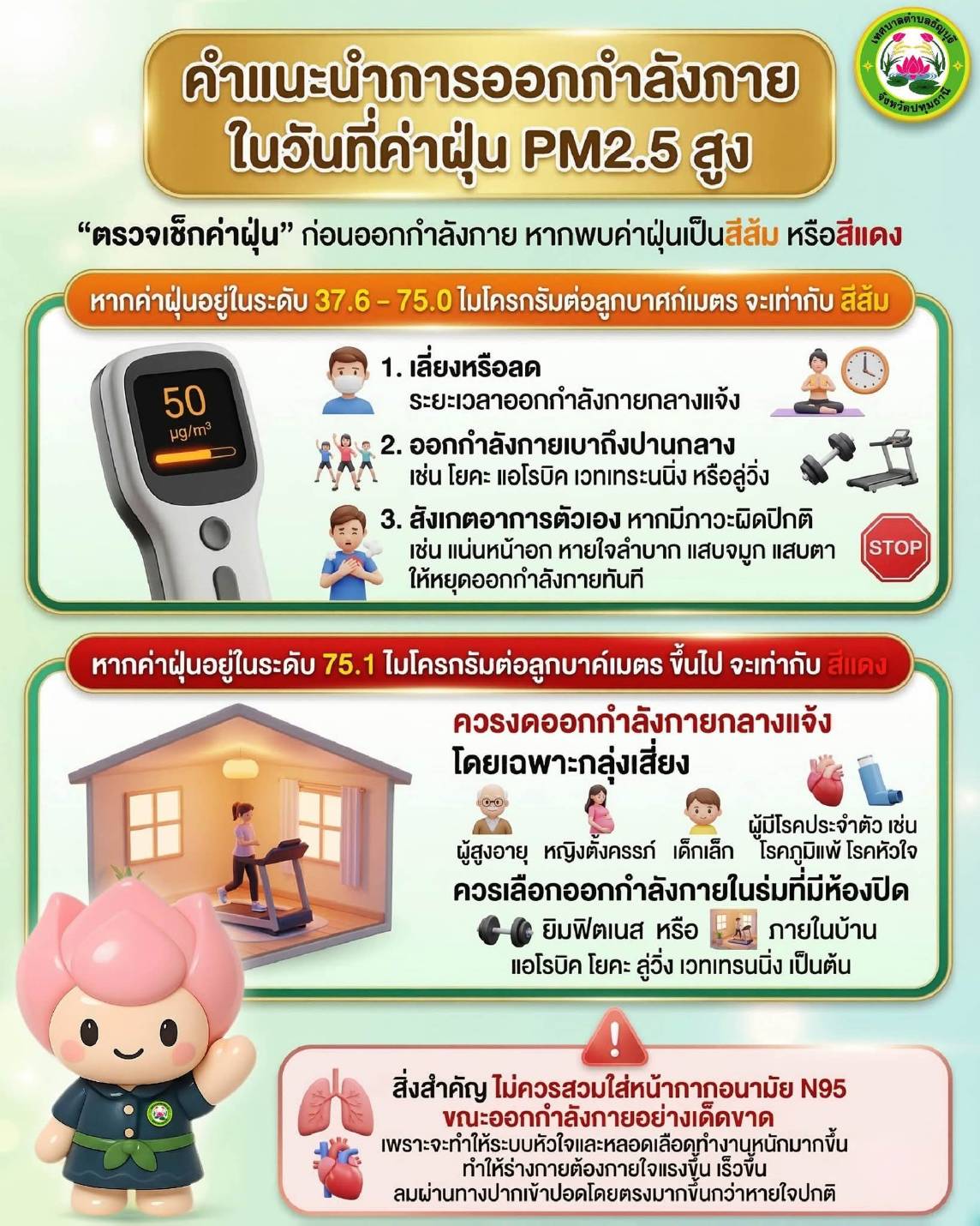 #PM25 #ฝุ่นPM25 #ดูแลสุขภาพ #ออกกำลังกายอย่างปลอดภัย #ห่วงใยสุขภาพประชาชน #ลดความเสี่ยงจากฝุ่น #เทศบาลตำบลธัญบุรี