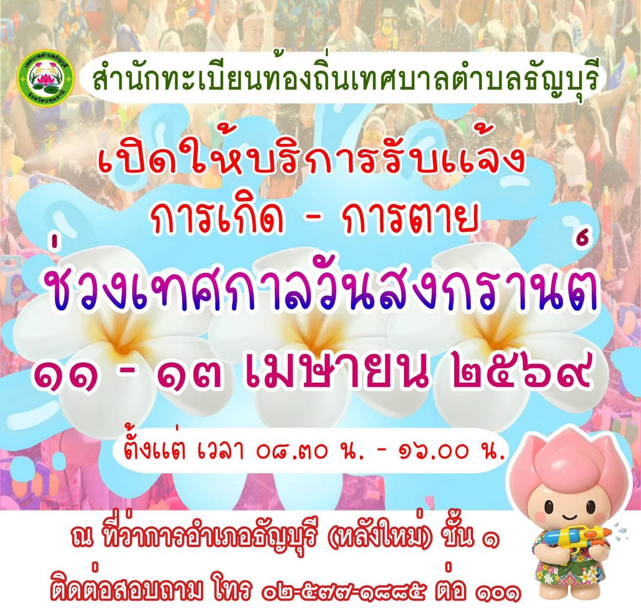 ขอประชาสัมพันธ์ข่าวสารจากสำนักทะเบียนท้องถิ่นเทศบาลตำบลธัญบุรี เรื่อง เปิดให้บริการรับแจ้งการเกิด - การตาย ช่วงเทศกาลวันสงกรานต์ ๑๑-๑๓ เมษายน ๒๕๖๙