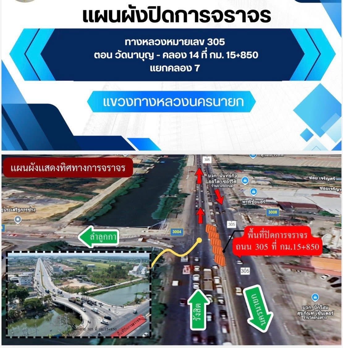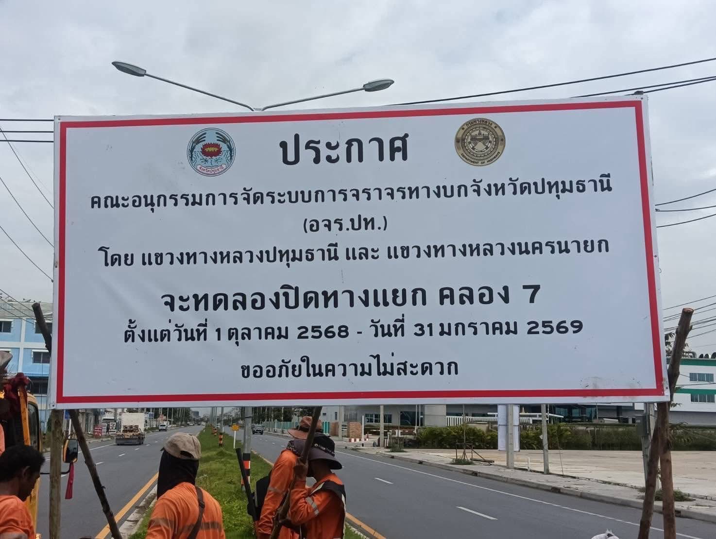 ได้รับแจ้งข่าวสารจากทางหลวง เพื่อให้เทศบาลตำบลธัญบุรีประชาสัมพันธ์ให้ประชาชนทราบว่า คณะอนุกรรมการจัดระบบการจราจรทางบกจังหวัดปทุมธานี (อจร.ปท.) ร่วมกับแขวงทางหลวงปทุมธานี และแขวงทางหลวงนครนายก จะดำเนินการ ทดลองปิดทางแยกคลอง 7 ตั้งแต่วันที่ 1 ตุลาคม 2568 ถึงวันที่ 31 มกราคม 2569